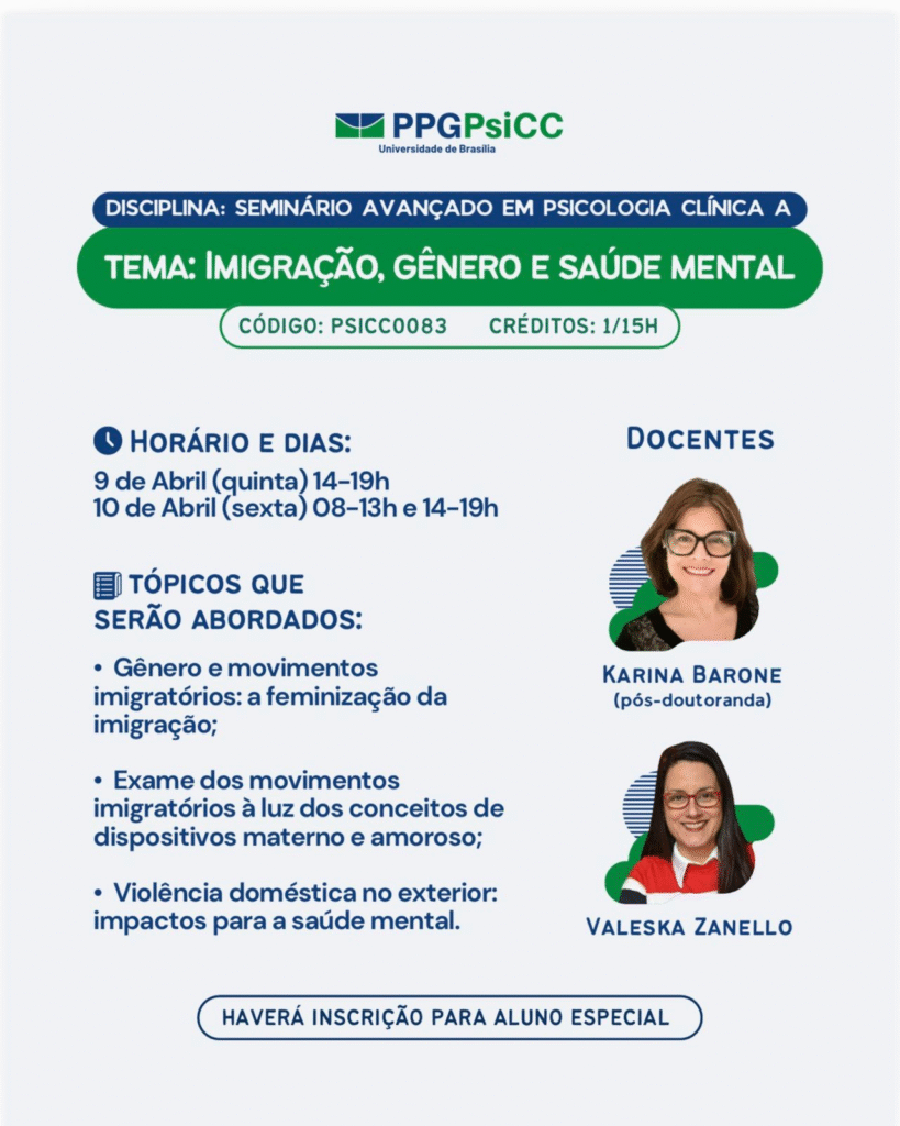 Atenção! O PPG-PsiCC está com uma disciplina que ocorrerá nos dias 09 e 10/04/2026 – serão dois dias de muita oportunidade de trocas e conhecimentos. Veja detalhes na imagem abaixo.